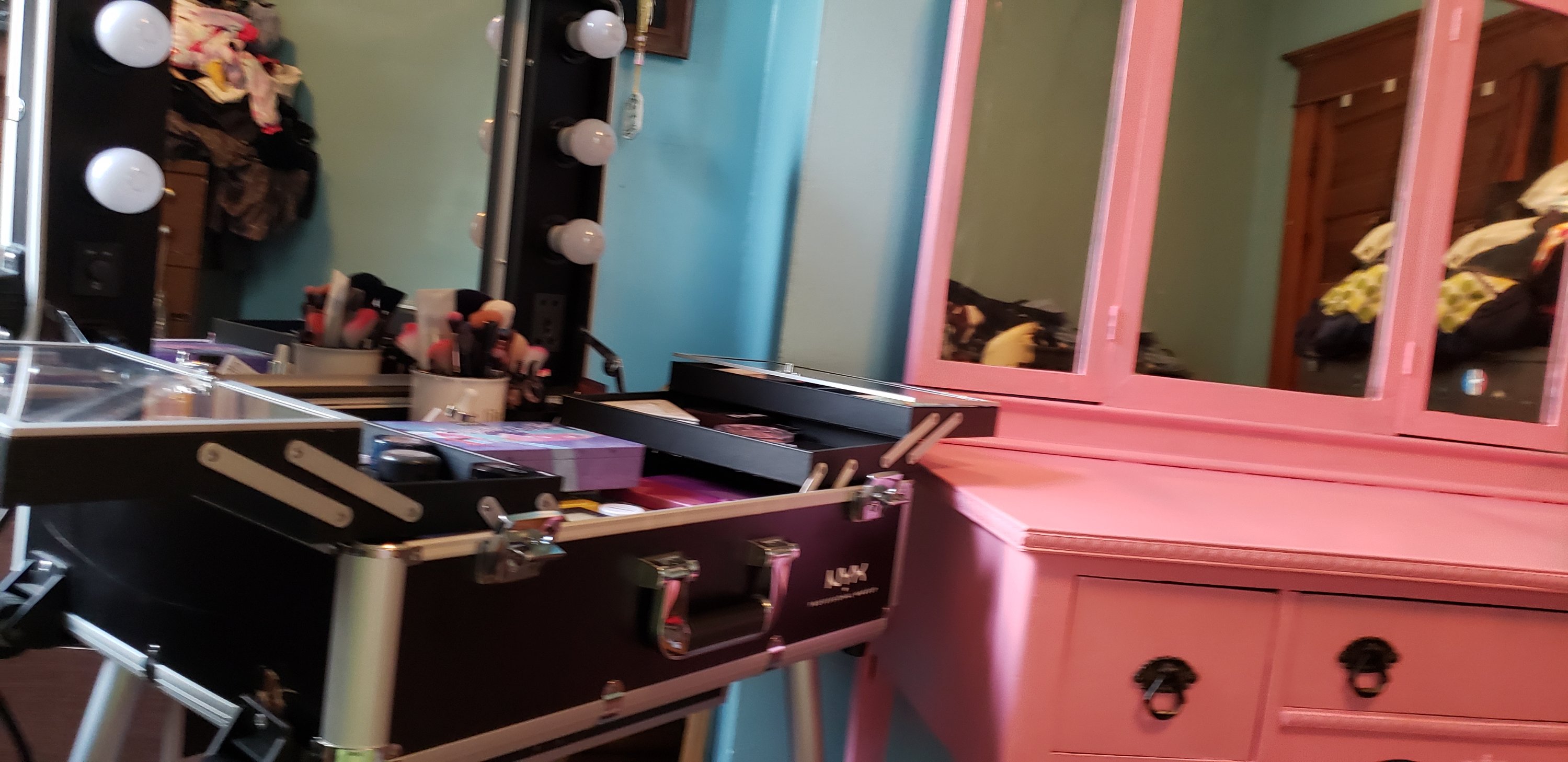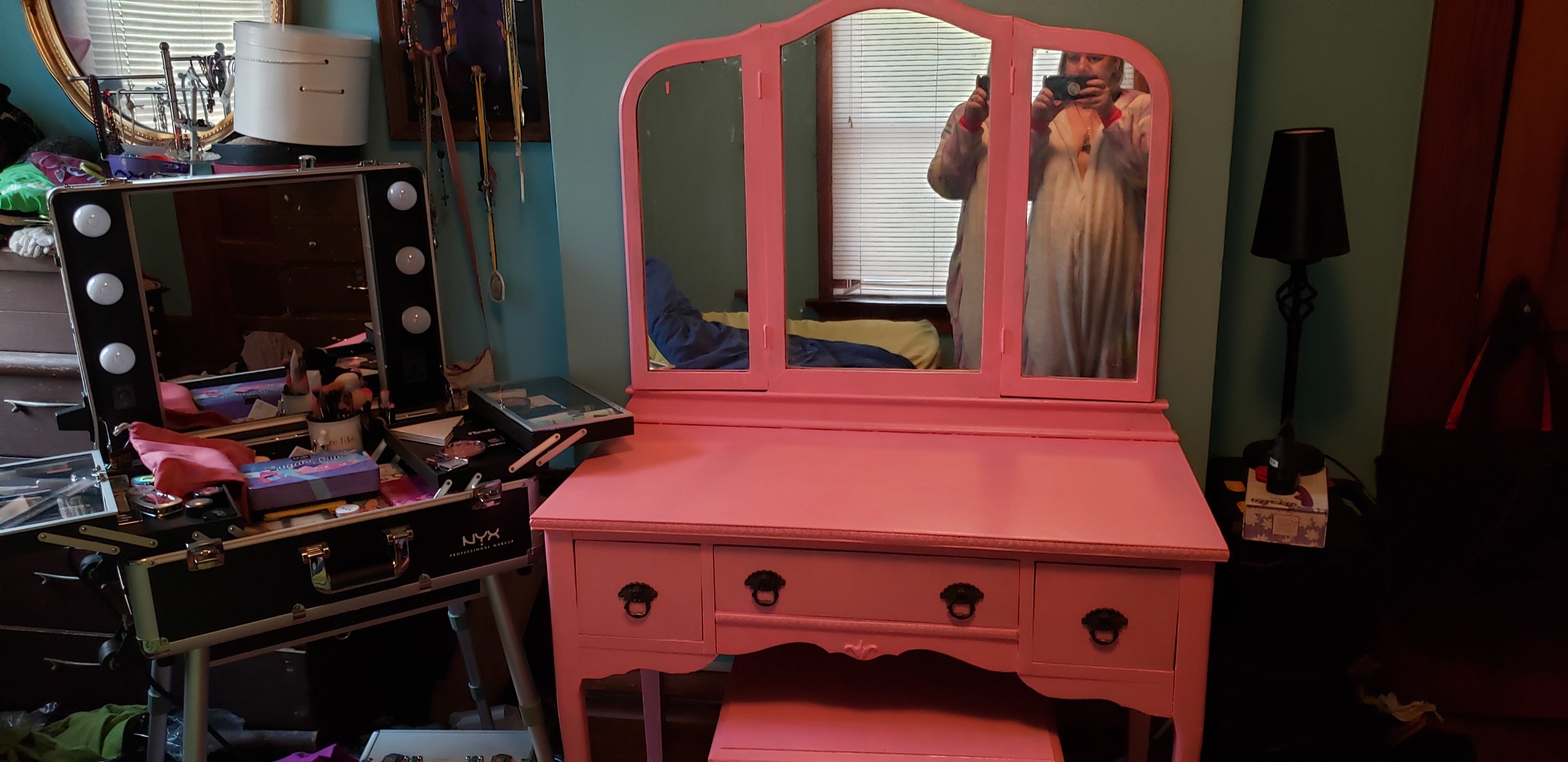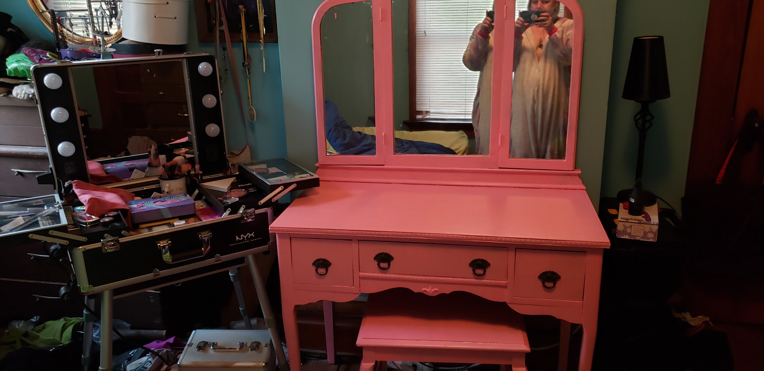 I rehomed a vanity that was my mother’s a couple of years ago after my aunt moved. It has been sitting in my bedroom acting as a catch-all since. I recently decided that I would like to set it up, alongside a nyx travelcase I bought off a local auction site (I got it for about $40 and it retails online for $500. A total steal!), and start getting ready there in the morning.