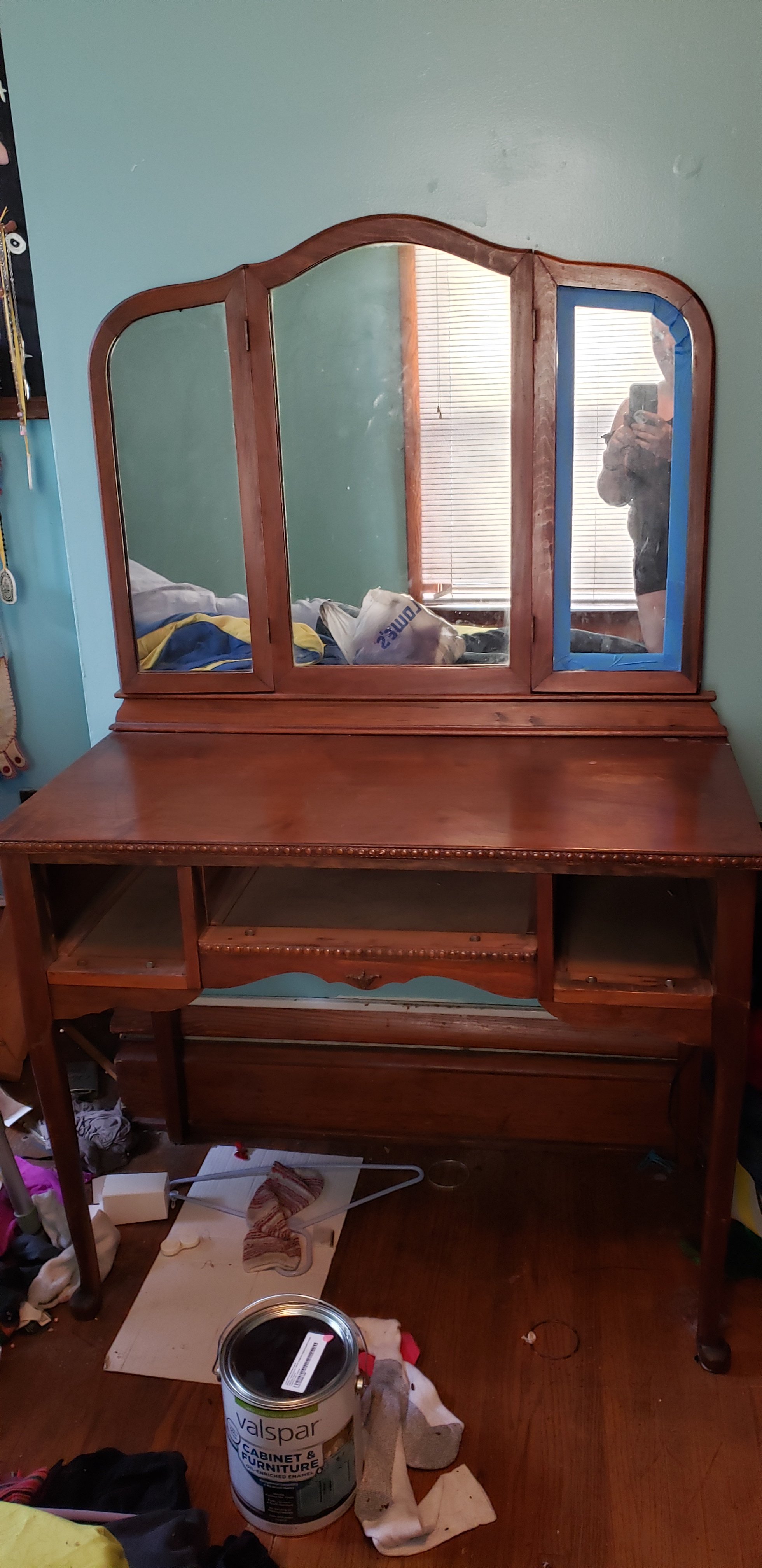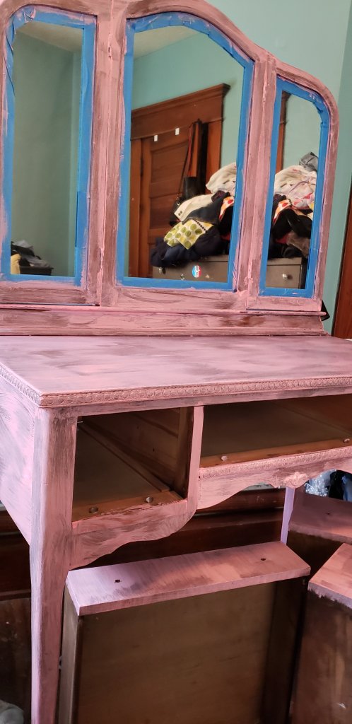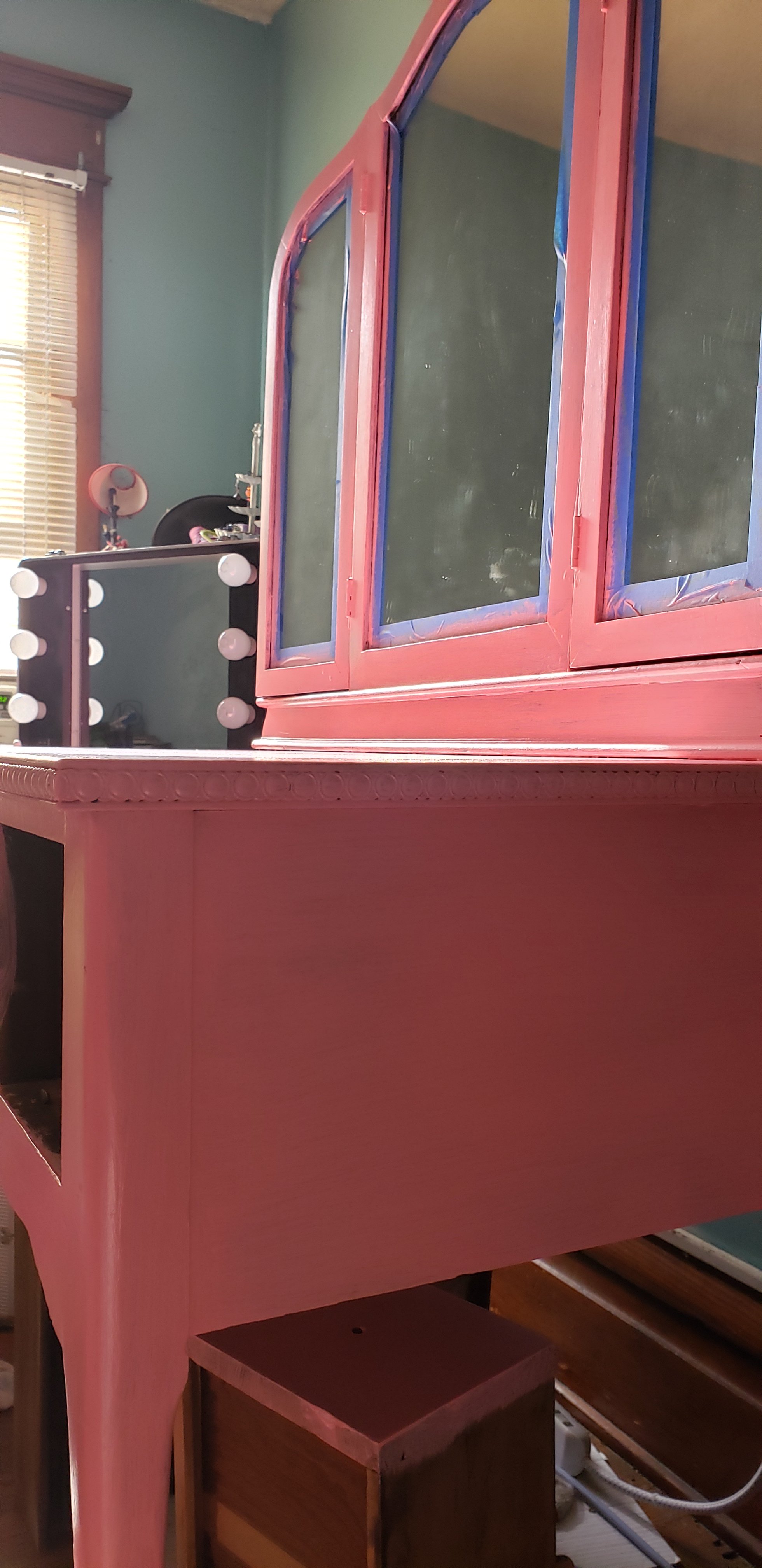 I rehomed a vanity that was my mother’s a couple of years ago after my aunt moved. It has been sitting in my bedroom acting as a catch-all since. I recently decided that I would like to set it up, alongside a nyx travelcase I bought off a local auction site (I got it for about $40 and it retails online for $500. A total steal!), and start getting ready there in the morning.