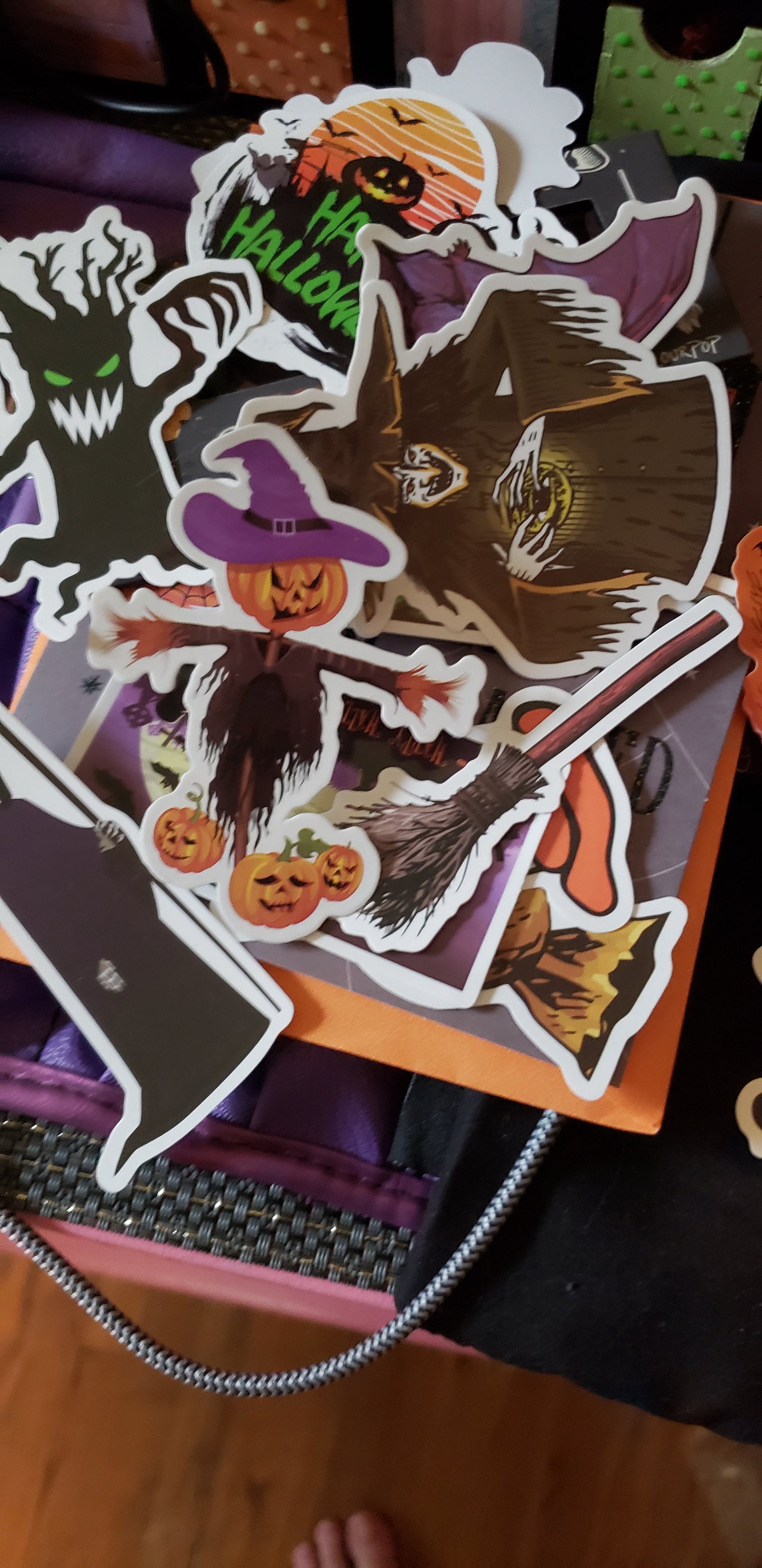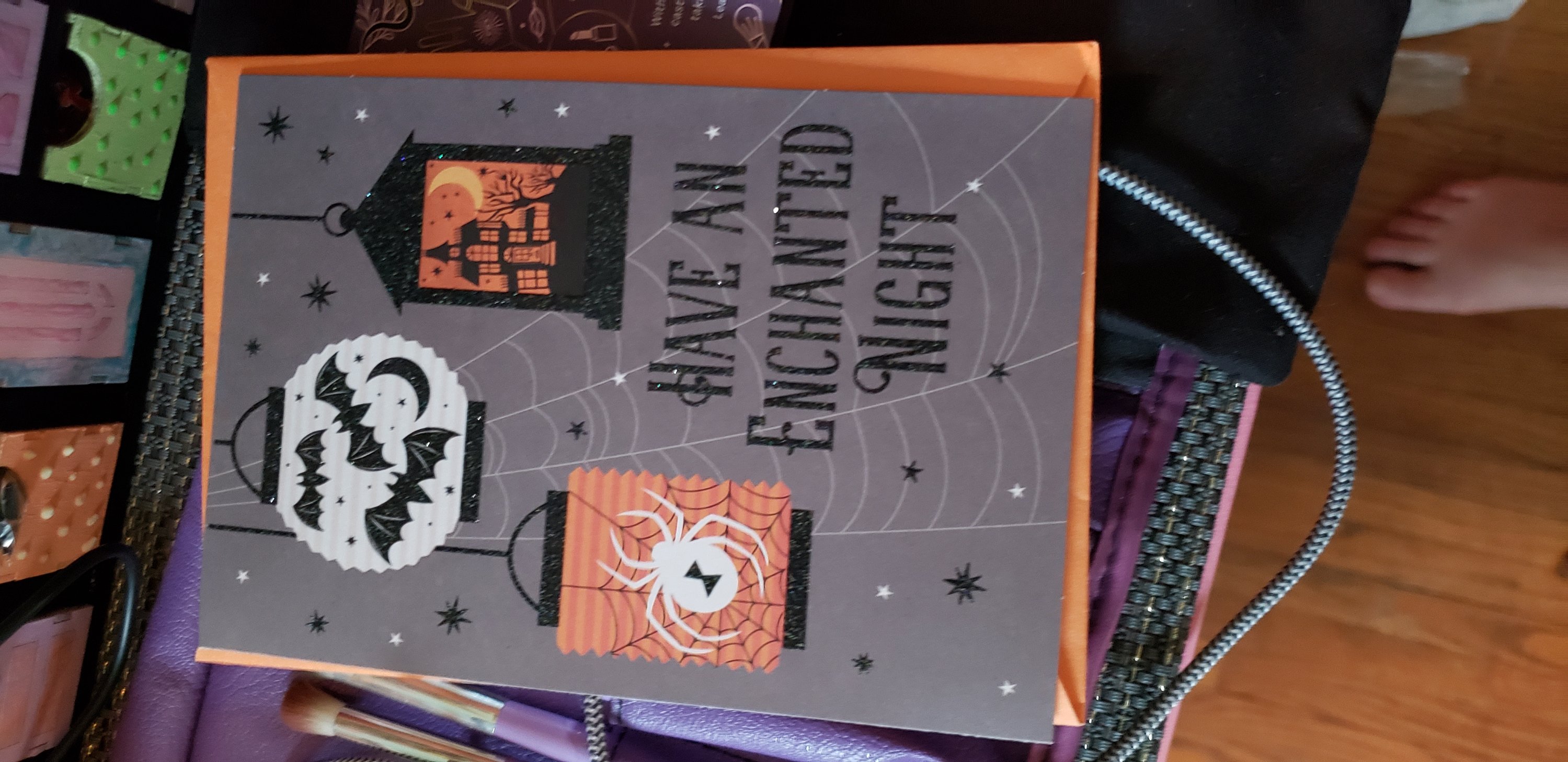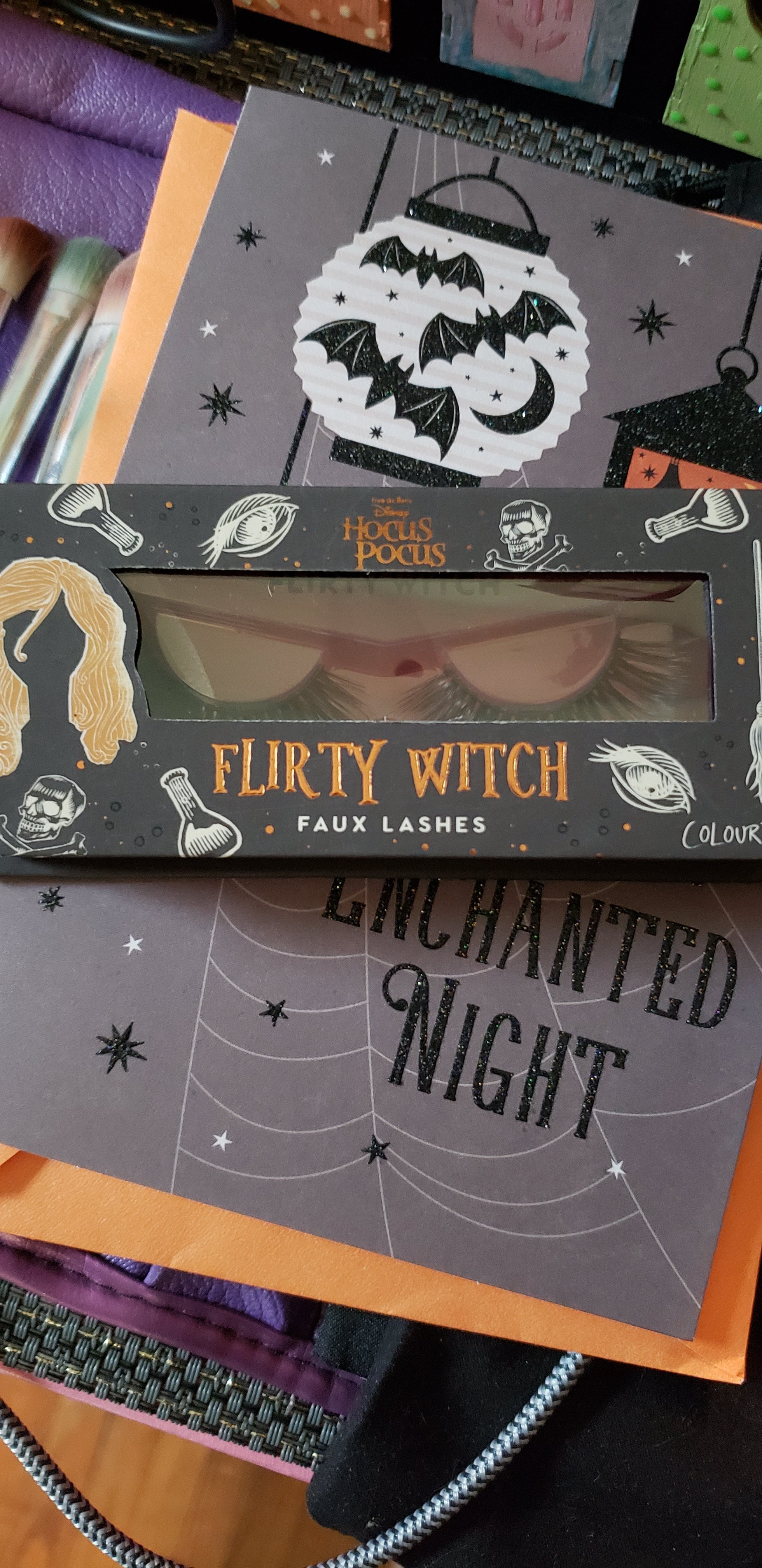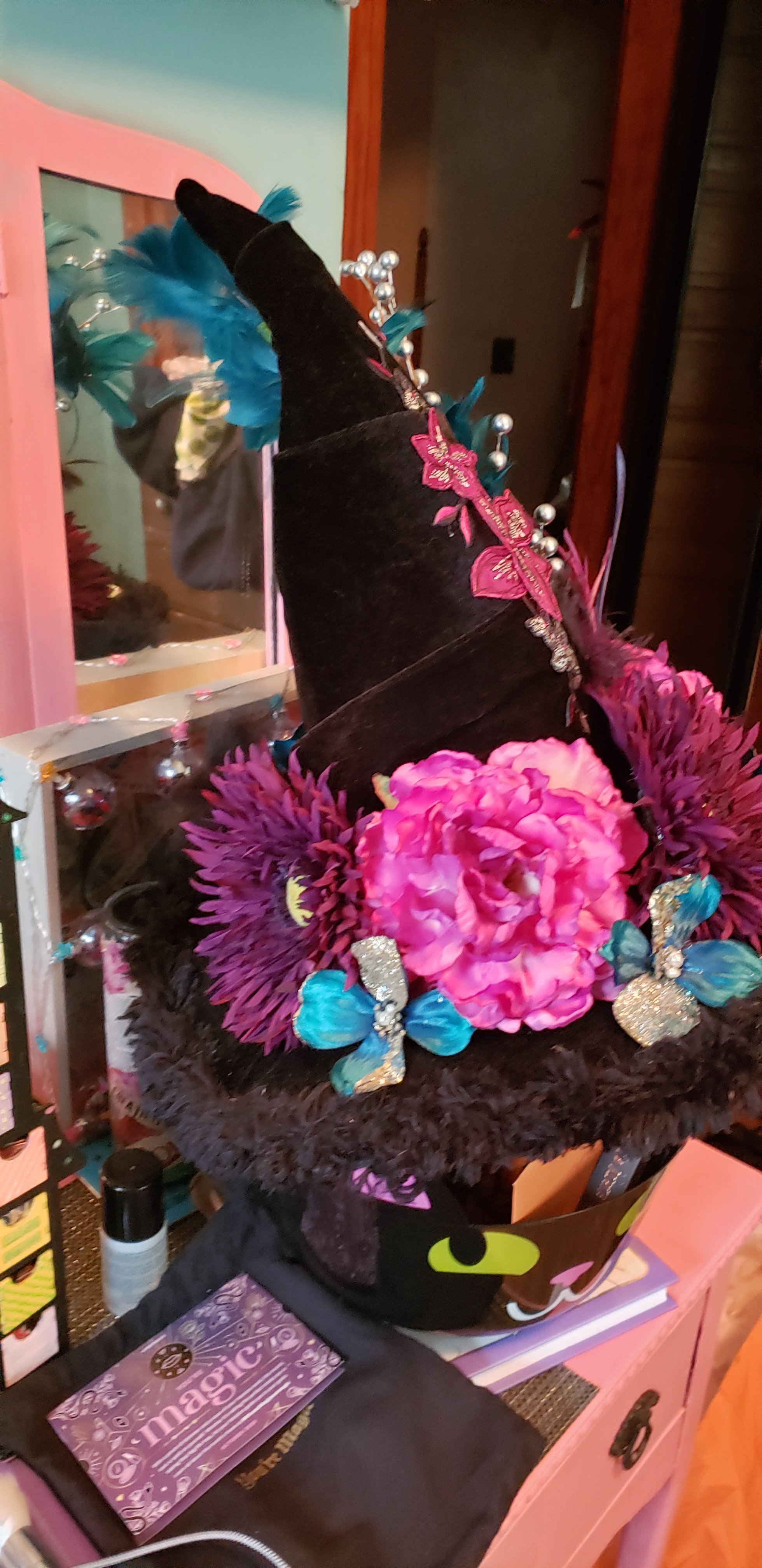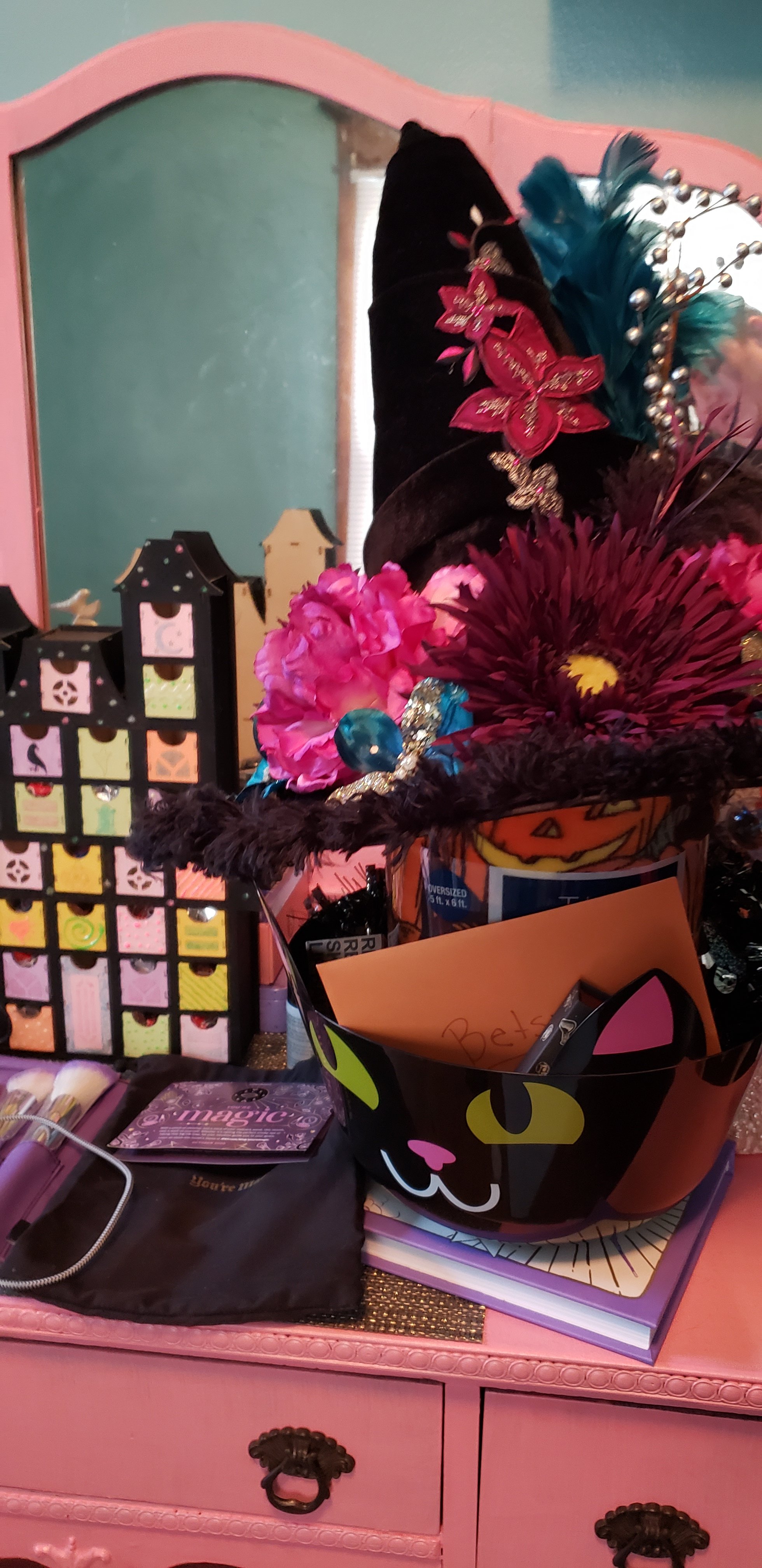 My buddy, Jessica, made me a witch hat decorated in pinks, purples and teals (my favorite colors). She also got me some Hocus Pocus eyelashes, a minty lipgloss in a black skull, a halloween throw for cold october nights and some adorable spooky ephemera. I love every piece, and have already begun to assemble a costume around the amazing hat. 💙💗💜