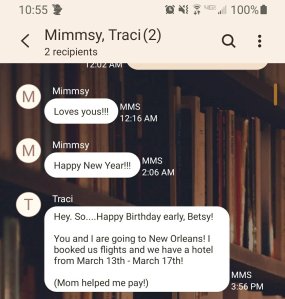 In January I got a test message from my sister, Traci, that said: Hey. So…Happy Birthday early, Betsy! You and I are going to New Orleans! I booked us flights and we have a hotel from March 13th -March 17th! (Mom helped me pay!)