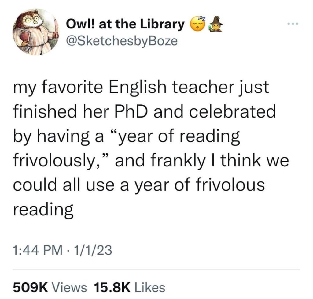Immediately I decided that this is my current situation…I am in my year of reading frivolously. 📚 I have been in school for so long that I have rarely read just for myself in the last 10 years. Now, since my masters degree is complete I am free to read just for the pure joy of reading. As on January first I have already read or listened to 10 books. I feel more like myself than I have in a very long time.
